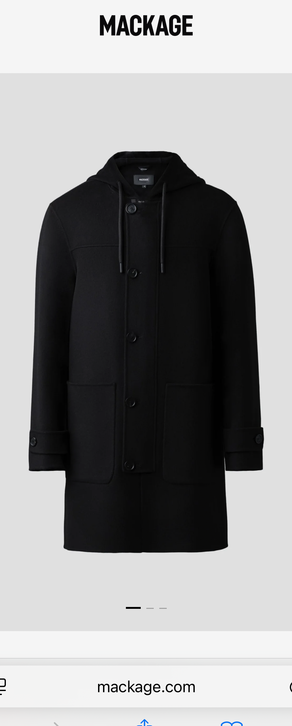15. MMS style ::JOSHUA Coat handmade double-face wool duffle long regular-fit size 46 , patch pockets and a center vent at back hem. Drawcord at hood and adjustable sleeves tabs with buttons at cuffs for adaptable protection against the elements. An elevated trans-seasonal staple with enduring quality. Sells at $1400, Starting live bid $250